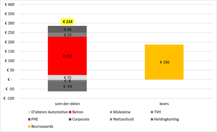 Het aandeel noteert op de beurs in Brussel al tijden ruim onder de geschatte waarde van alleen al het Belron-belang. Alle overige onderdelen van D’Ieteren - waaronder D’Ieteren Automotive actief als importeur van merken als VW, Skoda, Porsche en Audi, onderdelenleverancier TVH Parts voor vrachtwagens en landbouwmachines en notitieboekjes van Moleskine, krijgen dus vooralsnog ook een negatieve waarde opgeplakt.