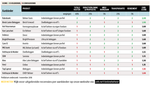 We hebben de verschillende aanbieders vergeleken op kosten, inhoud van de propositie, transparantie van dienstverlening en rendement. We hebben ook gekeken of aanbieders duurzaam beleggen, aangezien dit voor beleggers steeds relevanter gaat worden bij hun keuze voor een vermogensbeheerder. Kosten en inhoud van de propositie en transparantie van dienstverlening wegen daarbij het zwaarst. Op elk aspect hebben we beoordeeld of de aanbieder voldoende (een ‘2’) of onder de maat presteert. Rabobank Beheer basis en Binck Laten Beleggen komen als de betere aanbieders uit ons onderzoek naar voren. De verschillen in prestaties zijn aanzienlijk, vooral door de grote kostenverschillen. Maar eigenlijk zijn alle oplossingen duur gezien de beperkte dienstverlening. Uiteindelijk gebeurt er niet veel meer dan het herbalanceren van de portefeuille naar de vereiste verdeling. In de Verenigde Staten en Groot-Brittannië leveren partijen soortgelijke diensten voor tarieven vanaf 0,15 procent exclusief fondskosten. Er zijn geen overtuigende argumenten te verzinnen waarom de beheerkosten in Nederland vele malen hoger moeten zijn. Wie kiest voor online vermogensbeheer, betaalt erg veel voor een beetje gemak.