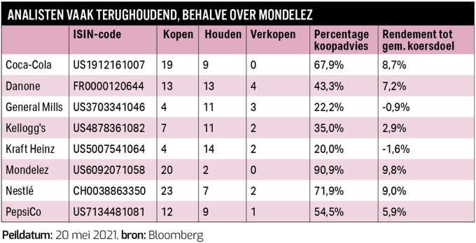 Het Amerikaanse Mondelēz International is de grote favoriet van de analisten die de acht aandelen op deze pagina’s volgen. Van de 22 geven er maar liefst 20 een koopadvies. Dat is opvallend, omdat analisten over de meeste aandelen in deze sector op zijn best terughoudend zijn. Het is een vrij dure sector geworden voor eentje die niet heel snel groeit.