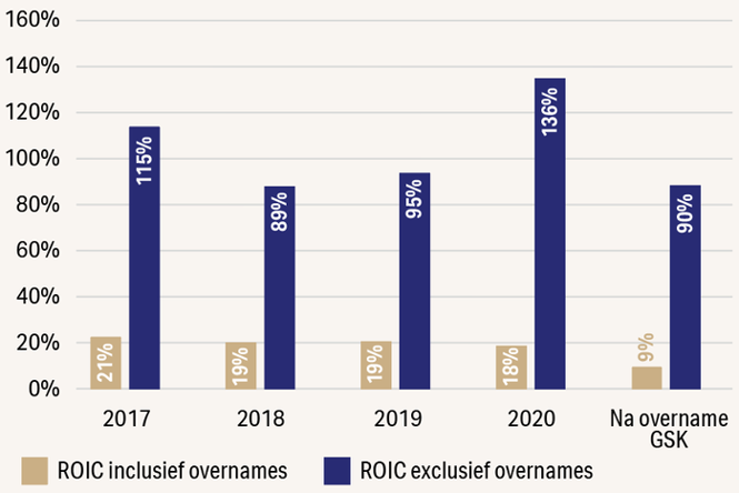 Stel nu dat Unilever toch de consumententak van GSK zou overnemen voor 60 miljard euro. Het geïnvesteerd kapitaal van 40 miljard euro zou hierdoor stijgen tot 100 miljard, terwijl bij de aangepaste winst van circa 7 miljard slechts een paar miljard zou kunnen worden opgeteld. De ROIC zou dalen van bijna 18 procent tot iets meer dan 9 procent.