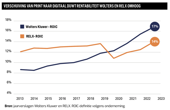 Rond de eeuwwisseling bestond het merendeel van de omzet bij Wolters Kluwer en RELX uit papier; van vaktijdschriften tot wetbundels en encyclopedieën. Vorig jaar vond nog maar vijf procent van de verkopen op gedrukt papier plaats. Een succesvolle transformatie is niet ieder bedrijf gegeven. Wat Wolters Kluwer en RELX vooral bijzonder maakt, is dat zij door de digitalisering een stuk winstgevender en rendabeler zijn geworden.
