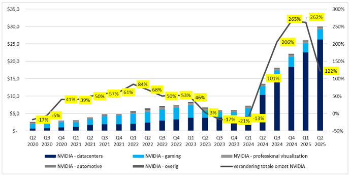 Bron: kwartaalverslagen NVIDIA. In donkerblauw de kwartaalomzet uit datacenters, in lichtblauw de omzet uit gaming. Bedragen in miljarden dollars. NVIDIA zit al in boekjaar 2025 (eindigend ultimo januari 2025). In geel uitgelicht de omzetgroei jaar-op-jaar per kwartaal.