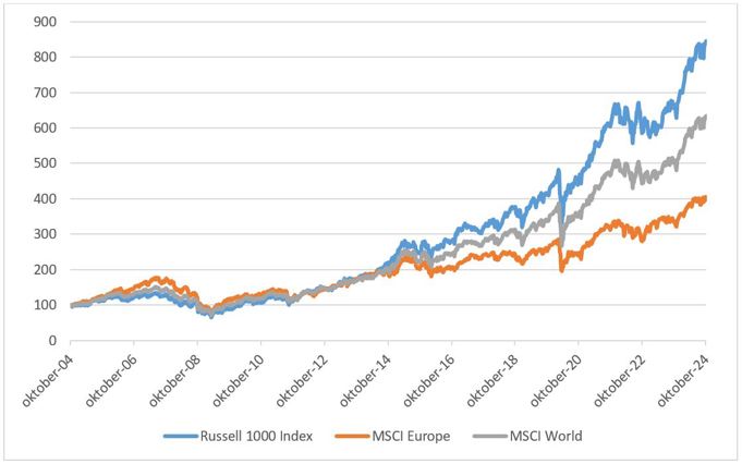 De sterke prestatie van de Amerikaanse dollar tegenover de euro tussen 2004 en 2024 heeft het rendement van Amerikaanse aandelen in euro’s verder versterkt.