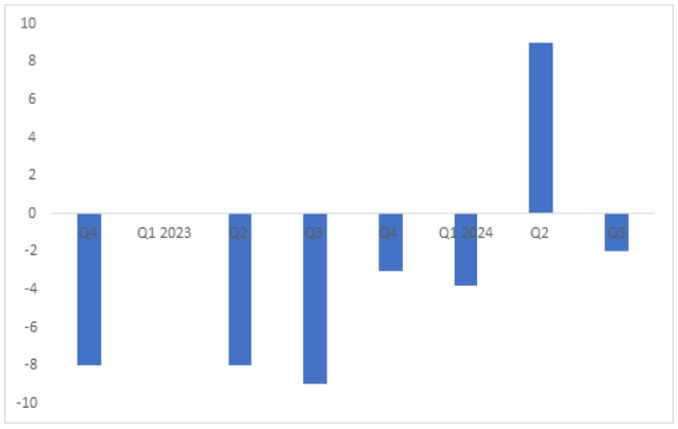 Bron: (Kwartaal)rapportages Philips. Grafiek toont de vergelijkbare ordergroei in procenten ten opzichte van hetzelfde kwartaal een jaar eerder. In het eerste kwartaal van 2023 (Q1 2023) was sprake van nulgroei.