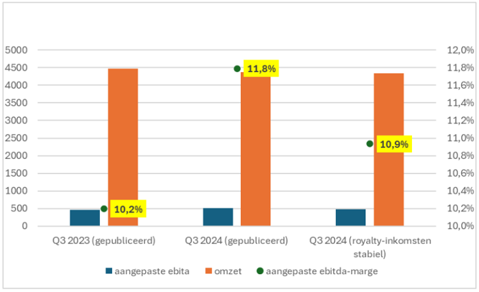 Het zijn vooral de buitengewoon hoge inkomsten uit merkenrechten - een stijging van 63 miljoen euro vorig jaar tot 105 miljoen euro in het net afgesloten derde kwartaal van 2024 - die de winstmarge een zetje omhoog geven.