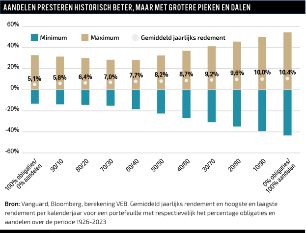 In het slechtste kalenderjaar, 1931, ging ruim 43 procent van de waarde van een belegging die volledig in aandelen zat verloren. Spreiding over een deel obligaties verkleinde deze bandbreedte. De gemiddeldes in de grafiek zijn berekend over de gehele 97 jaar; een belegger zit natuurlijk maar een deel van die periode in de markt. Iemand die dicht bij het eind van zijn horizon zit, zal waarschijnlijk een groter deel in obligaties beleggen (waarover later meer in deze serie).