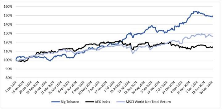 Tabaksaandelen deden het een stuk beter dan de wereldwijde MSCI World Index en onze eigen AEX (zie onderstaande grafiek).
