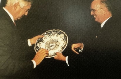 Foto uit het het VEB-jaarverslag 2001. Bolkestein krijgt uit handen van VEB-voorzitter Zwart het Blauwe Bord overhandigd.