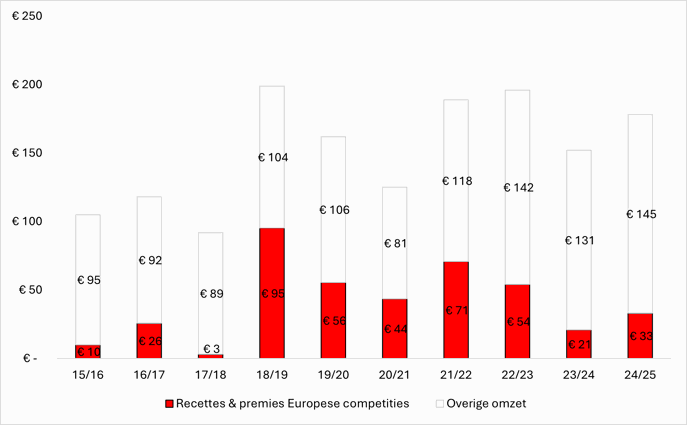 Wel is het contrast met de hoogste Europese competitie groot: dit seizoen toucheert Ajax alleen al circa 19 miljoen euro aan startgeld voor de Champions League. Daar komen nog inkomsten uit kaartverkoop en winstpremies bovenop.