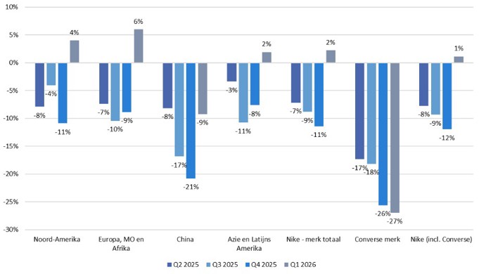 Voor het tweede kwartaal, dat bij Nike loopt van september tot en met november, rekent het bedrijf op een lichte omzetdaling. Over heel boekjaar 2026 mikt Nike op stabilisatie: de groothandel groeit weer, de rechtstreekse verkoop blijft achter, Noord-Amerika en Europa trekken het herstel en China en Converse blijven remmend werken.
