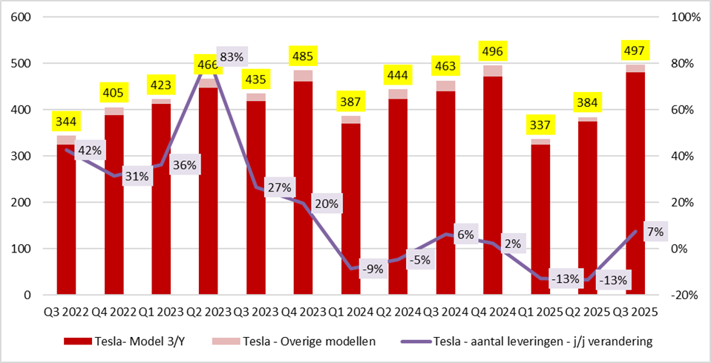 Tesla heeft in het derde kwartaal van 2025 een recordaantal van 497 duizend voertuigen geleverd, zo blijkt uit vorige week gepubliceerde cijfers. Dat is twaalf procent boven de consensusverwachting van 443 duizend en liefst 29 procent meer dan in het tweede kwartaal. De autofabrikant wist daarmee de markt positief te verrassen, maar de beurskoers reageerde gelaten en daalde licht. Beleggers twijfelen of het huidige verkoopniveau houdbaar is nu de Amerikaanse belastingprikkel voor elektrische auto’s is afgelopen.