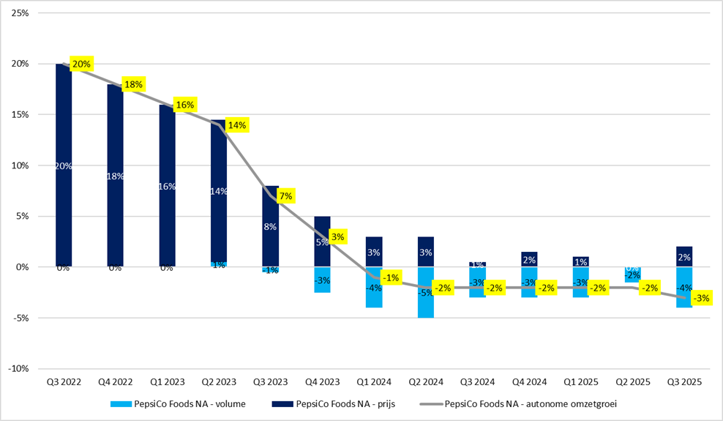 Bron: kwartaalrapportages PepsiCo. Prijs- en volumeontwikkeling per kwartaal t.o.v. hetzelfde kwartaal in het voorgaande jaar (percentage op hele cijfers afgerond). Autonome groei PepsiCo Foods North America uitgelicht in geel.
