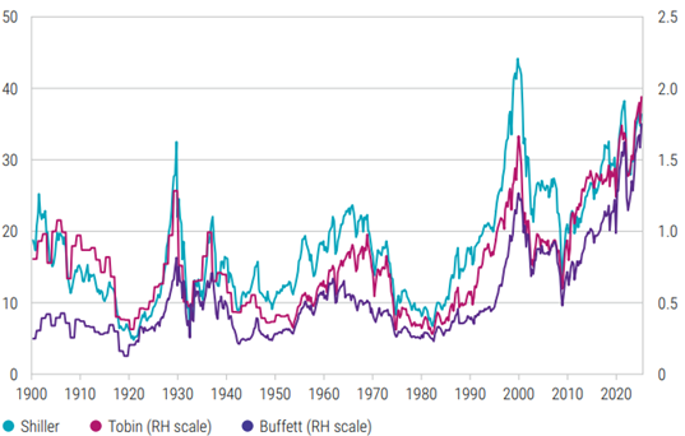 Bron: Robeco, The Stale Renaissance. CAPE linker-as, Tobin’s Q en Buffett-indicator rechter-as.