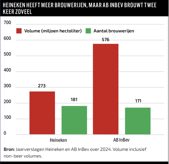Heineken verkoopt ongeveer 89 miljoen hectoliter bier op het continent en doet dat via meer dan vijftig brouwerijen. AB InBev brouwt in Noord-Amerika ongeveer evenveel volume met slechts achttien fabrieken.