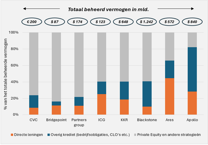 Bron: Bedrijfswebsites en gepubliceerde cijfers van CVC, Bridgepoint, Partners Group, ICG, KKR, Blackstone, Ares en Apollo.