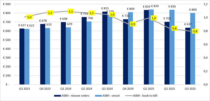 Bron: verslaggeving ASMI. Bedragen in miljoenen euro’s. Uitgelicht in geel de book-to-bill ratio.