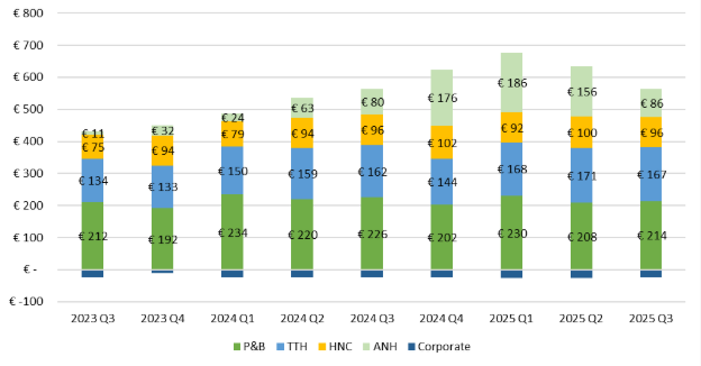 De voedingsactiviteiten Taste, Texture & Health (TTH) en Health, Nutrition & Care (HNC) draaiden over het algemeen stabiel, zonder echte uitschieters. TTH presteerde iets boven verwachting, met een EBITDA van 167 miljoen euro, en zag de marge licht aantrekken dankzij efficiëntere productie. Wel blijven klanten, met name in Azië, voorzichtig met hun bestellingen.