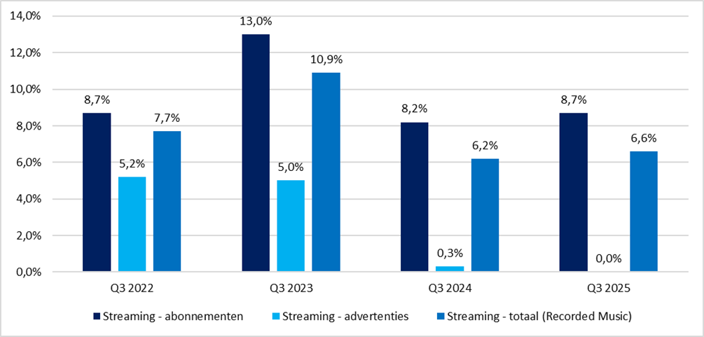 De sterkste impuls kwam uit de verkoop van albums, die met ruim 18 procent toenam tot 341 miljoen euro – het hoogste niveau in jaren. De lancering van The Life of a Showgirl, het nieuwe album van Taylor Swift, zorgde voor een verkoopexplosie. Wereldwijd gingen meer dan vijf miljoen exemplaren over de toonbank in de eerste weken na de release, waarmee een nieuw record werd gevestigd.