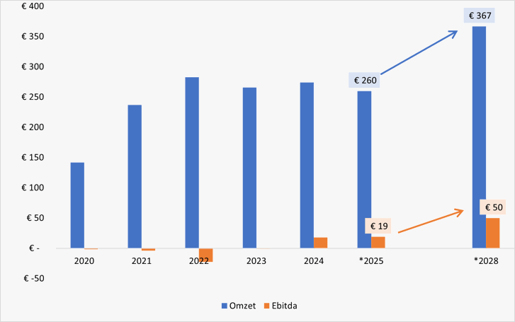 Wie de doelstellingen van het management doorrekent, komt uit op een ebitda van circa vijftig miljoen euro in 2028, tegenover naar verwachting achttien tot twintig miljoen euro dit jaar. Als die doelen worden gehaald, impliceert het huidige bod een waardering van ongeveer vier keer de ondernemingswaarde over drie jaar. Hoewel doelen mogelijk ambitieus zijn, oogt het bod wel erg mager.