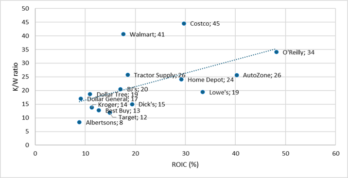 In waarderingsanalyses waarbij de k/w wordt afgezet tegen het rendement op geïnvesteerd kapitaal (ROIC) komt Walmart steevast als één van de hoogste uit (zie onderstaande grafiek). De huidige multiple ligt daarbij niet alleen ver boven het eigen langjarig gemiddelde van circa 20 keer, maar ook structureel boven de waardering van sectorgenoten met vergelijkbare marges en groeiprofielen.