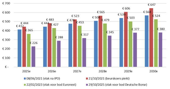 Die omslag werkt door in de waardering. In de vrije kasstroomtaxaties van de Britse zakenbank Barclays, dat Allfunds sinds de beursgang volgt, is de prognose voor 2025 teruggevallen van 412 miljoen euro vlak na de beursgang naar 226 miljoen euro vlak voor het bod van Deutsche Börse. Ook de verwachtingen verder vooruit zijn nu fors lager dan circa 4 jaar geleden. De opeenvolgende neerwaartse bijstellingen zijn duidelijk zichtbaar (zie onderstaande grafiek).
