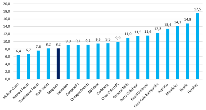 De waardering van Magnum is lastig omdat er geen goed vergelijkbare beursgenoteerde ijsbedrijven zijn. Froneri is de beste peer, maar staat niet op de beurs. Daarom kijken analisten naar een mix van diepvries-, zuivel-, bottel- en snackbedrijven. Operationeel lijkt Magnum volgens analisten het meest op bottelaars en zuivelproducenten, die net als Magnum werken met een kapitaalintensieve koudeketen en complexe logistiek. Deze groep handelt gemiddeld rond 10 keer ebitda en geldt daardoor als de meest redelijke benchmark.