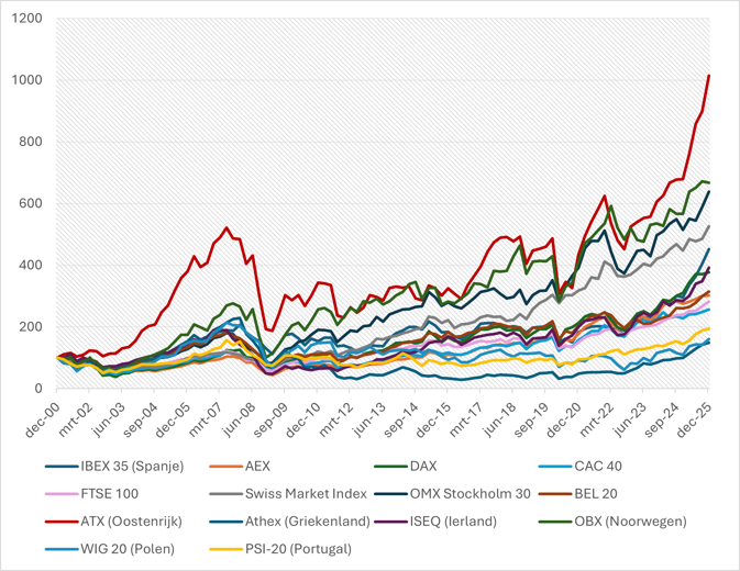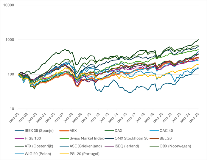 Bron: Bloomberg, bewerking VEB. Koersen in euro’s per kwartaal. Netto totaalrendement ultimo 2000 tot en met 22-12-2025, behalve OMX Stockholm (start maart 2002) en Athex (start juni 2001).