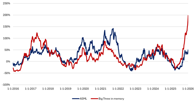 Bron: Bloomberg. Berekening VEB. Jaar-op-jaar koersverandering (inclusief dividend) van ASML en memory-aandelen (gelijk gewogen mandje van Samsung, SK Hynix en Micron in euro’s).