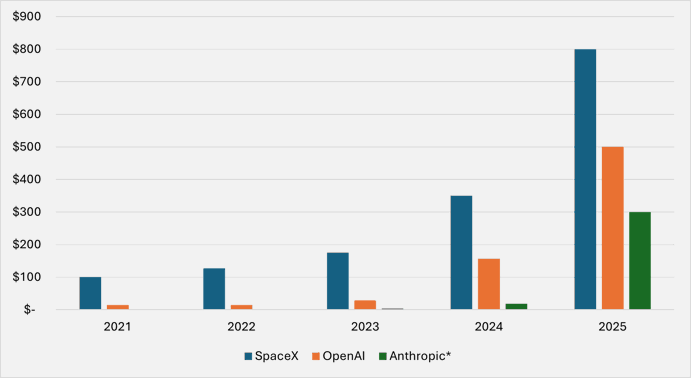 Bron: Sacra, Bloomberg, Reuters en Financial Times. Balken reflecteren de meest recente waardering per jaareinde van ieder jaar op de x-as. Bedragen in miljarden Amerikaanse dollars. *Voor Anthropic is voor de periode 2023 geen waardering publiek beschikbaar.