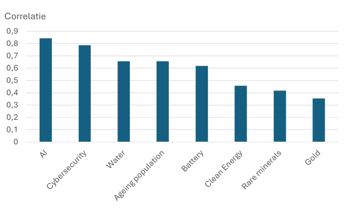 Bij andere thema-ETF’s ligt dat anders. Daar is de samenhang met de brede markt lager, bijvoorbeeld bij goud, zeldzame metalen en groene energie. Zulke fondsen reageren sterker op zaken als grondstofprijzen, aanbod uit mijnen en subsidies of vergunningen, en minder op de algemene beursrichting. Dat maakt ze bruikbaar voor spreiding, omdat ze niet tegelijk meebewegen met de rest van de portefeuille.