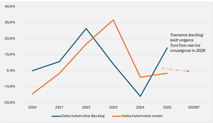 Bron: TomTom. De lijnen tonen de procentuele verandering ten opzichte van een jaar eerder van de Automotive-backlog en de Automotive-omzet. *TomTom geeft voor 2026 alleen een omzetbandbreedte voor Location Technology en voor de groep als geheel. Als Automotive ongeveer hetzelfde aandeel houdt, wijst dit op een lagere Automotive-omzet in 2026. Dit blijft een inschatting.