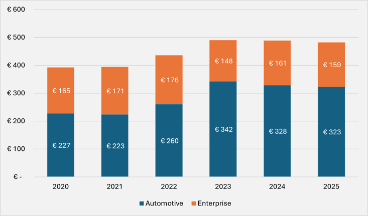 Duidelijke omzetstagnatie in de laatste jaren bij zowel Enterprise als Automotive