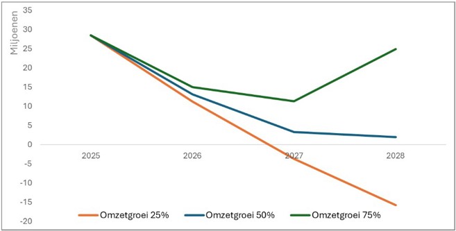 Bron: NX Filtration en scenarioanalyse VEB. Y-as: kaspositie (miljoenen euro). Lage groei leidt tot snelle kasuitstroom; bij 50 procent blijft het krap; pas bij 75 procent herstelt de kas.