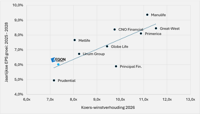Op basis van kapitaalgeneratie is zo’n vergelijking alleen lastig: het is geen gestandaardiseerd boekhoudkundig begrip en de definities verschillen sterk per verzekeraar. Daarom zetten we Aegon en de Amerikaanse peers naast elkaar op basis van de nettowinst en de verwachte winstgroei.