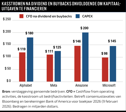 Na dividenduitkeringen en aandeleninkopen is de geplande capex in 2026 zelfs groter dan de resterende operationele kasstroom, zo becijferden analisten. Dat betekent dat de investeringsgolf alleen houdbaar is als bedrijven bereid zijn dividend en aandeleninkoop te herzien, of hun balans zwaarder te belasten met schulden.