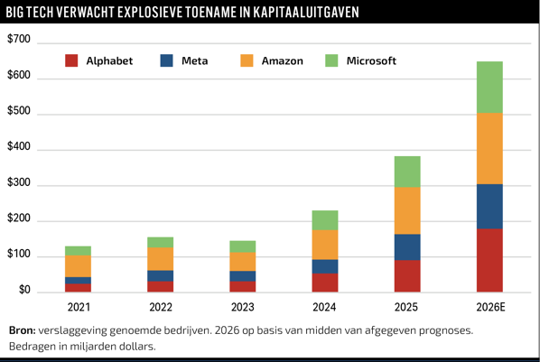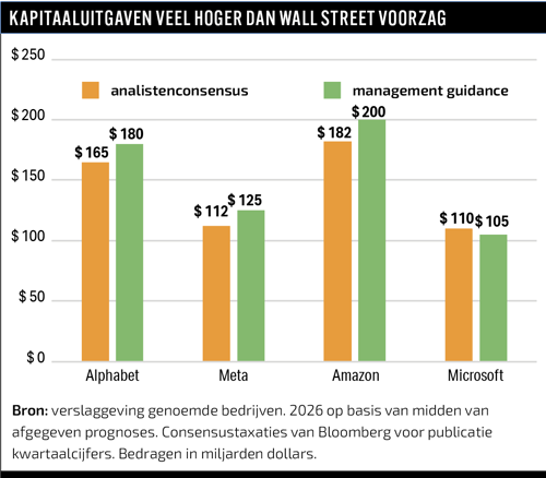 Amazon kondigde aan zijn capex (kapitaaluitgaven) in 2026 op te voeren tot zo’n 200 miljard dollar, fors boven de verwachtingen. Alphabet verhoogde zijn capex-raming richting 175 tot 185 miljard dollar. Microsoft rapporteerde een stijging van 66 procent in kwartaaluitgaven aan datacenters. Meta liet weten zijn investeringen voor dat jaar bijna te verdubbelen.