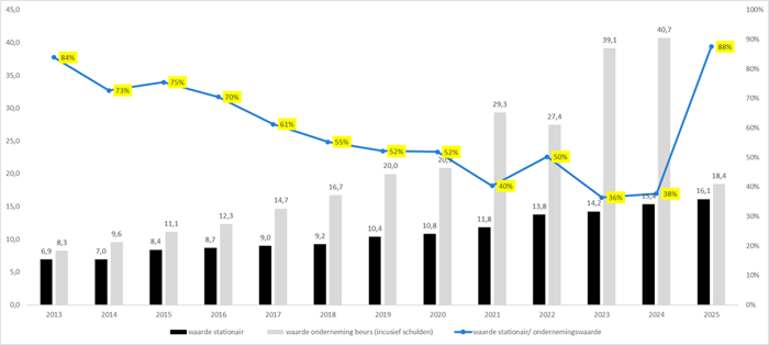 Bron: jaarverslagen en Bloomberg. Bedragen in miljarden euro’s. De blauwe lijn toont welk deel van de ondernemingswaarde wordt verklaard door de huidige winst zonder groei.