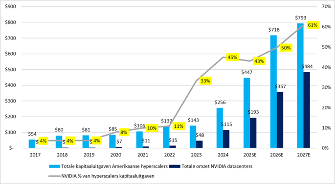 Maar daar ligt ook de kwetsbaarheid. Nvidia is inmiddels goed voor ongeveer de helft van de AI-uitgaven van deze grote cloudbedrijven (zie onderstaande grafiek). Nvidia’s groei leunt sterk op de bereidheid van een handjevol bedrijven om miljarden aan datacenters te blijven uitgeven. Als één van hen het investeringsritme verlaagt, wordt dat direct zichtbaar in de cijfers. De bedragen zijn inmiddels zo groot dat zelfs een lichte vertraging meteen miljarden verschil kan maken.