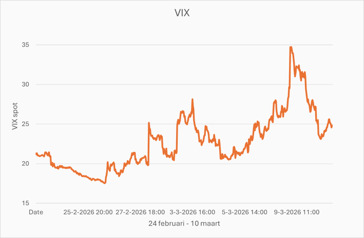 Na het weekend van de aanval schoten de gas‑ en olieprijzen omhoog en liep ook de VIX op tot bijna 35 punten. Nadat president Trump verklaarde dat het conflict snel voorbij zou zijn, zakte de index ogenblikkelijk terug naar rond de 24.