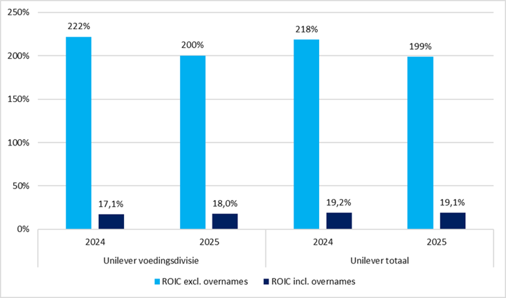 Wat de divisie onderscheidt, is de kwaliteit van die winst. De operationele marges zijn hoog, de investeringsbehoefte relatief beperkt en de kasconversie sterk. Dat vertaalt zich in een solide ROIC die, zowel operationeel als na correctie voor in het verleden betaalde overnamepremies, niet onderdoet voor die van de rest van Unilever en in sommige gevallen zelfs hoger ligt (zie onderstaande grafiek), terwijl de groei achterblijft.
