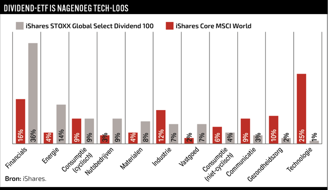 De iShares STOXX Global Select Dividend 100 wijkt duidelijk af van een MSCI World-etf. De selectie en weging op dividend leiden tot een forse blootstelling aan financials en energie-aandelen. Die behoren tot de grootste dividendbetalers. Technologiebedrijven, meestal groeiaandelen die relatief weinig dividend uitkeren, komen nauwelijks door het filter.