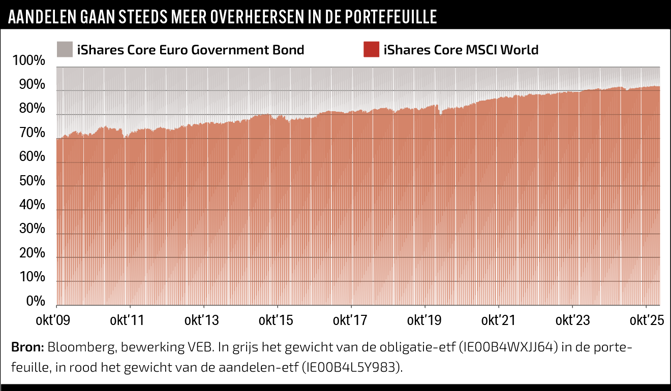 De portefeuille wordt na verloop van tijd automatisch steeds meer een aandelenportefeuille, doordat de MSCI World-etf beter presteert. Na een jaar is de oude verdeling al niet meer van toepassing en hebben aandelen een gewicht van 72 procent. Begin maart 2026 ligt dat op 92 procent en zit nog maar 8 procent in obligaties. De beter presterende etf vormt gestaag een groter deel van de portefeuille en is uiteindelijk dominant.