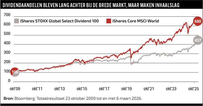 Dividend 100 beter dan de wereld-index. Selecteren op dividendrendement is echter geen garantie: bij economische tegenwind kunnen uitkeringen worden verlaagd, juist wanneer de markt al nerveus is.