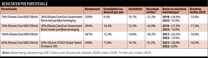 Dividendaandelen kunnen in sommige jaren bescherming bieden, maar blijken geen structureel alternatief voor obligaties als schokdemper. In het slechtste jaar, 2022, wist de dividend-etf de schade te beperken. In het voorjaar van 2020 ging de iShares STOXX Global Select Dividend 100 echter nog harder omlaag dan de brede markt. Daarmee is het maximale verlies, de drawdown, voor de gecombineerde aandelenportefeuille nog groter. De koersschommelingen, gemeten met de volatiliteit, zijn met de toevoeging van dividendaandelen nauwelijks kleiner dan met alleen de MSCI World-etf.