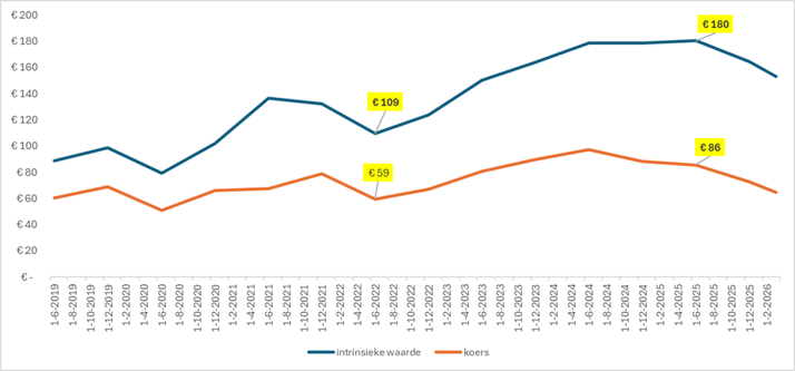 Het eindpunt pakt juist bijzonder gunstig uit. De meetperiode stopt eind juni, ruim vóór de officiële einddatum in 2025. Op dat moment stonden zowel de koers als de intrinsieke waarde relatief hoog (zie grafiek).