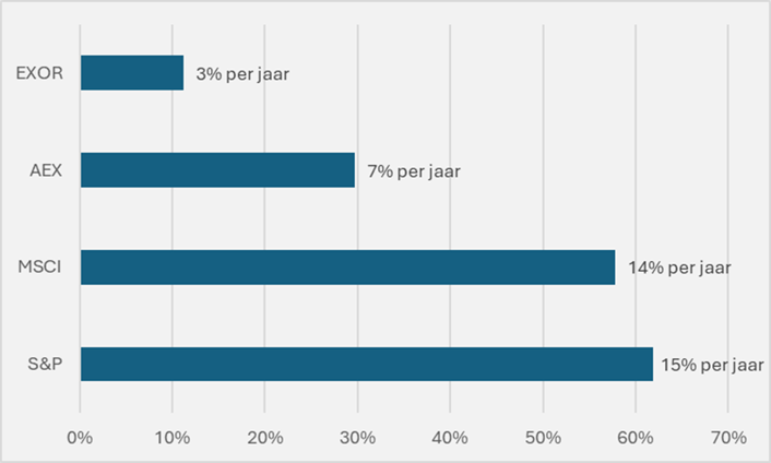 Dat is hier moeilijk vol te houden. Sinds de verplaatsing van de notering naar Amsterdam in de zomer van 2022 blijft Exor achter. Het aandeel steeg met slechts enkele procenten per jaar, terwijl brede indices als de AEX (7 procent per jaar), MSCI World (14 procent per jaar) en S&P 500 (15 procent per jaar) rendementen lieten zien die twee tot vijf keer hoger liggen.