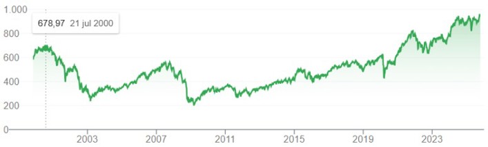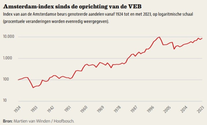 Wees je in ieder geval bewust van de belangrijkste aanname achter deze beurswijsheid: de waarde van aandelen blijft stijgen op lange termijn. Ongeacht diverse heftige beurscrashes is tot nu toe altijd gebleken dat de markt zich herstelt. Hoewel resultaten uit het verleden geen garanties geven voor de toekomst, laten historische aandelenkoersen zien dat de beurs op de zeer lange termijn stijgt ondanks crises. Dat zie je terug in het onderstaande voorbeeld van de belangrijkste Nederlandse index, de AEX-index.