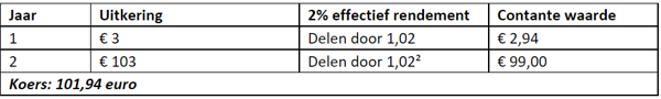 De koers van een obligatie is een optelsom van alle betalingen die (naar verwachting) plaatsvinden in de toekomst, maar dan tegen de waarde die is teruggerekend naar dit moment. De huidige waarde van betalingen die in de toekomst liggen is bij een positieve rente kleiner dan het bedrag dat je ontvangt.